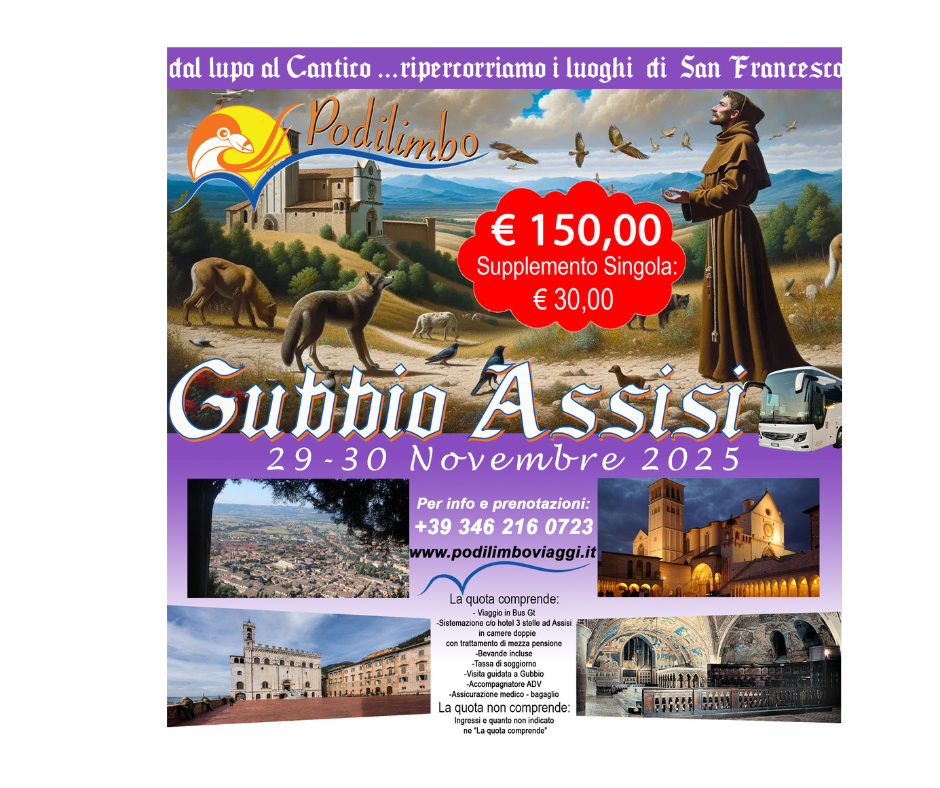 Ritrovo dei partecipanti nei luoghi prestabiliti in orario da definire –.Sistemazione in bus riservato e partenza - sosta tecnica lungo il percorso – Arrivo a Gubbio, dove San Francesco trovò rifugio dopo la conversione, e dove si narra che ammansi’ il lupo feroce che spaventava i cittadini , una fra le città più caratteristiche dell’Umbria, piena di fascino per il suo intatto e genuino aspetto medievale racchiusa tra mura antiche, chiamata anche la città dei “matti” a causa dell'indole libera, imprevedibile e scanzonata dei suoi abitanti– visita guidata della città: Piazza Quaranta martiri, Il Loggiato dei tiratori dell’arte della lana, Piazza Grande, il Palazzo dei Consoli, il Duomo - al termine un po' di shopping nei suoi caratteristici mercatini – trasferimento ad Assisi - sistemazione in hotel nelle camere riservate - cena – ore 21.00 partecipazione alla processione Aux Flambeaux con partenza dalla Piazza di Santa Maria degli Angeli , proseguendo poi verso la basilica per la benedizione finale. Durante l'evento vengono accese candele e viene recitato il rosario, seguito dalla processione vera e propria con canti e preghiere. – rientro in hotel per il pernottamento